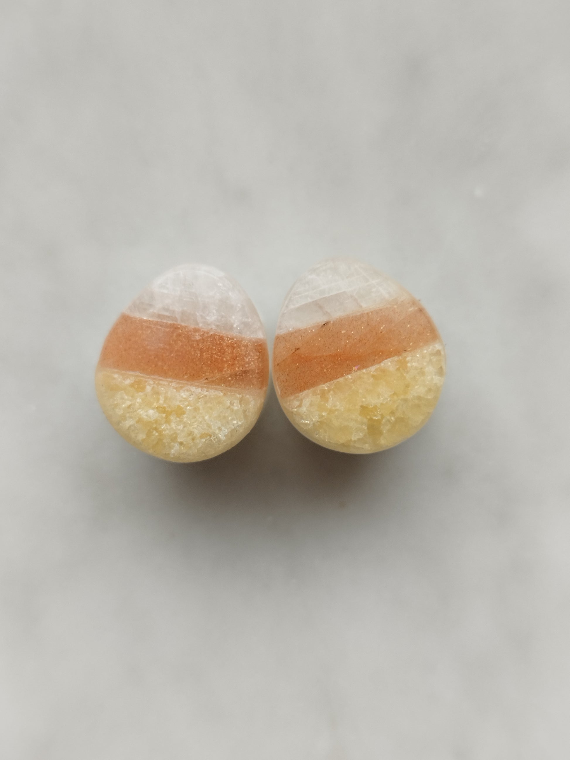 Moonstone teardrops with candy corn overlays. I made the candy corn from yellow calcite, sunstone and white moonstone