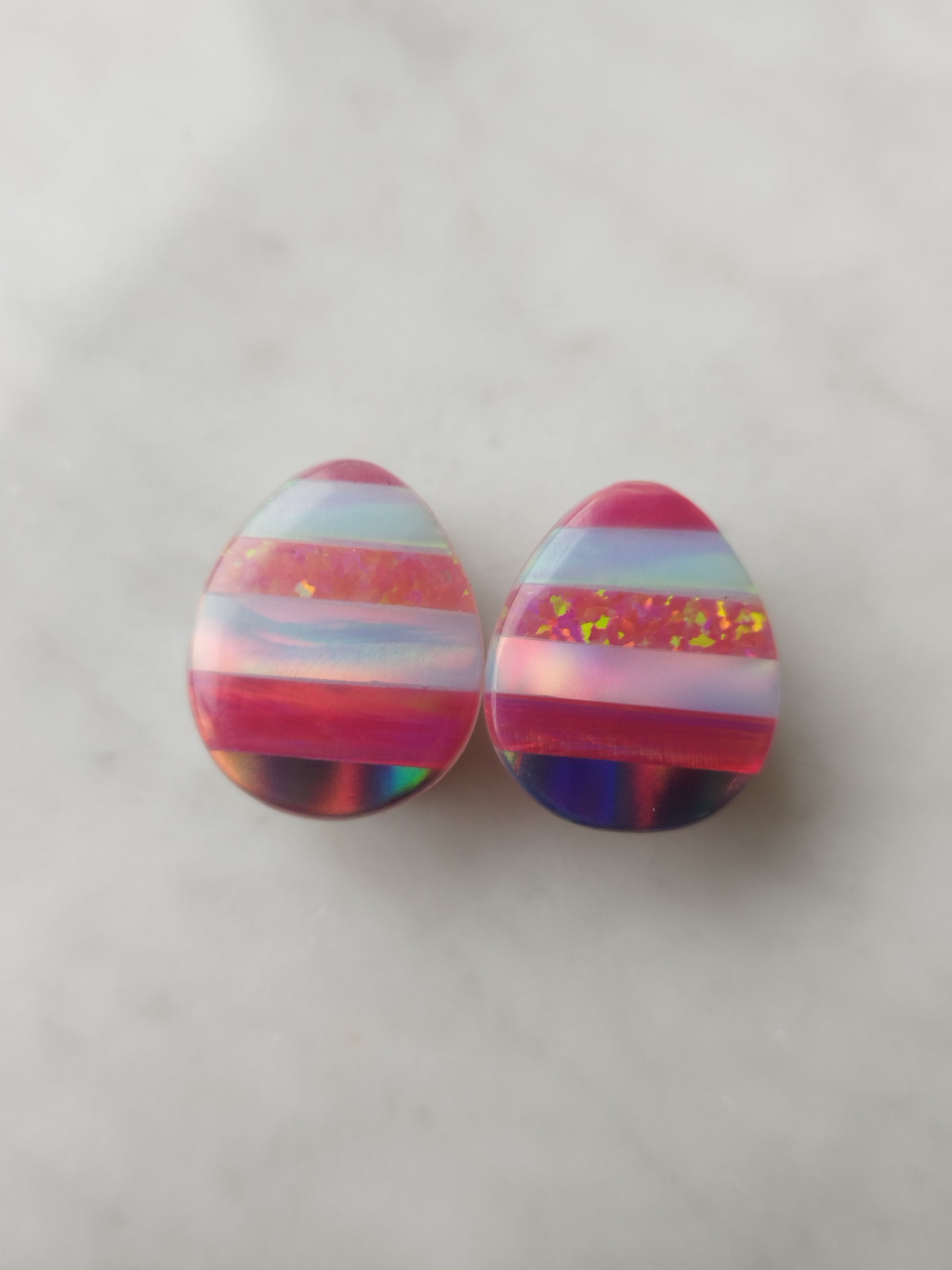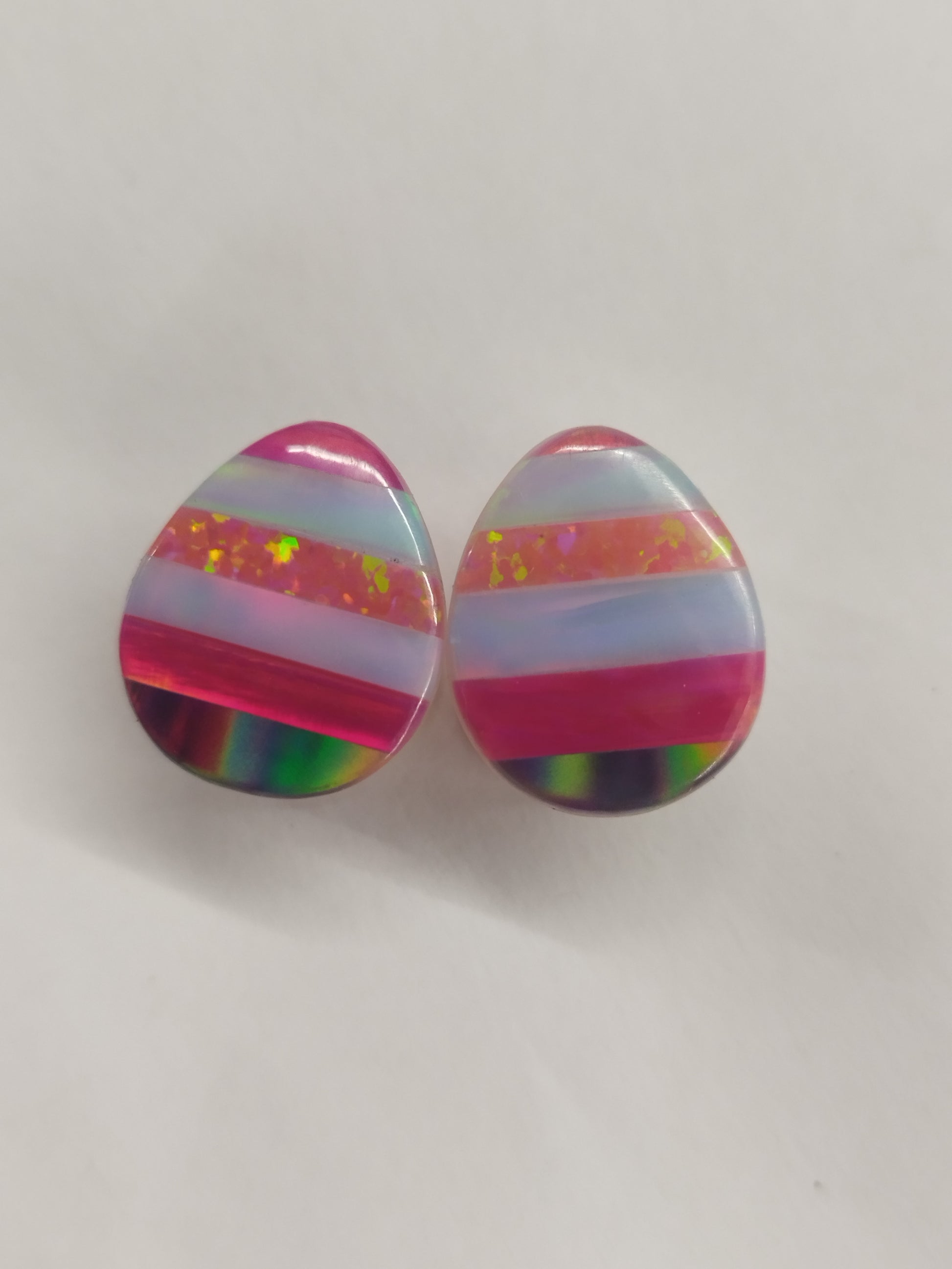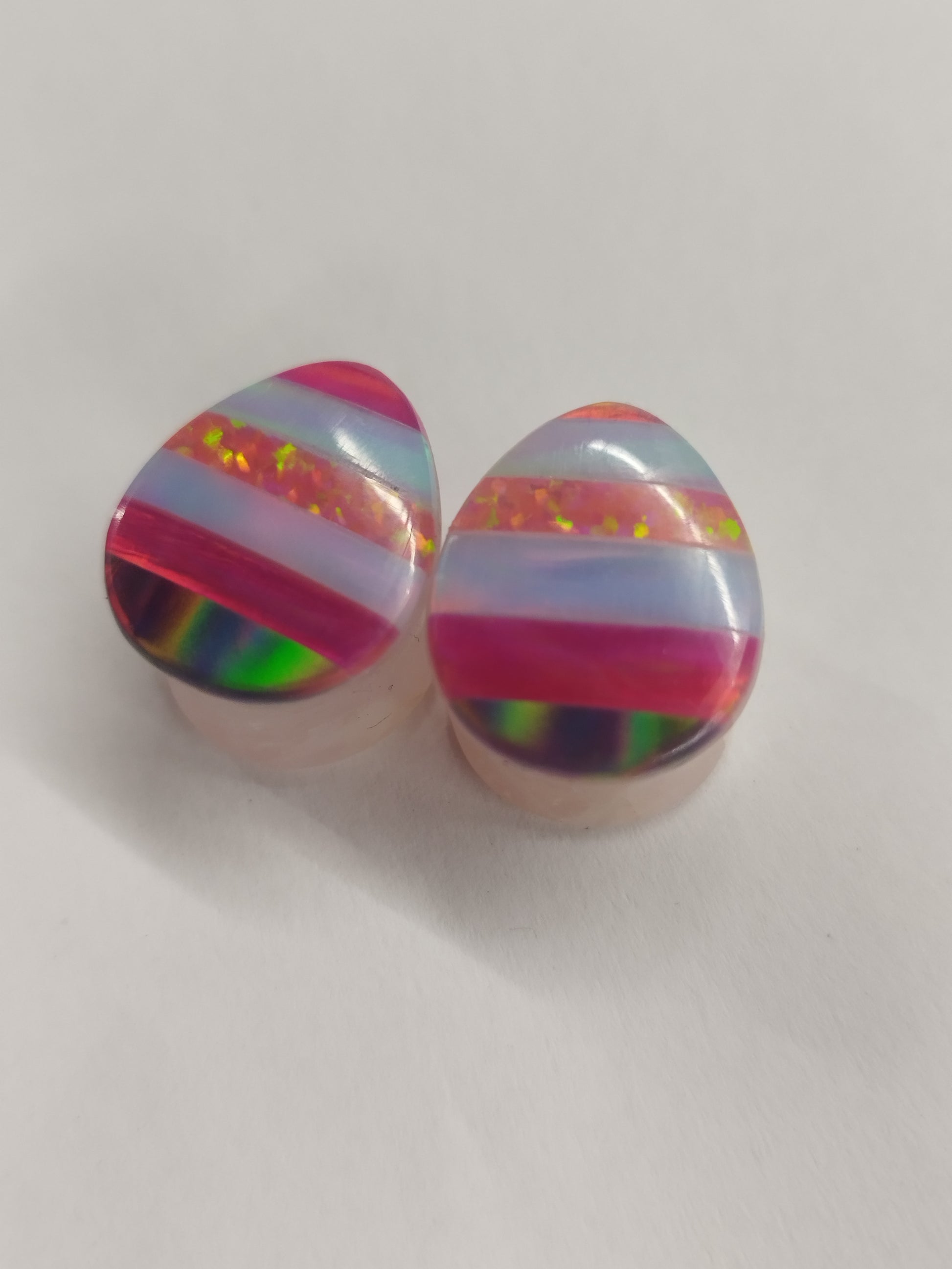 Obsidian plugs with a patchwork of different aurora opal overlays.
