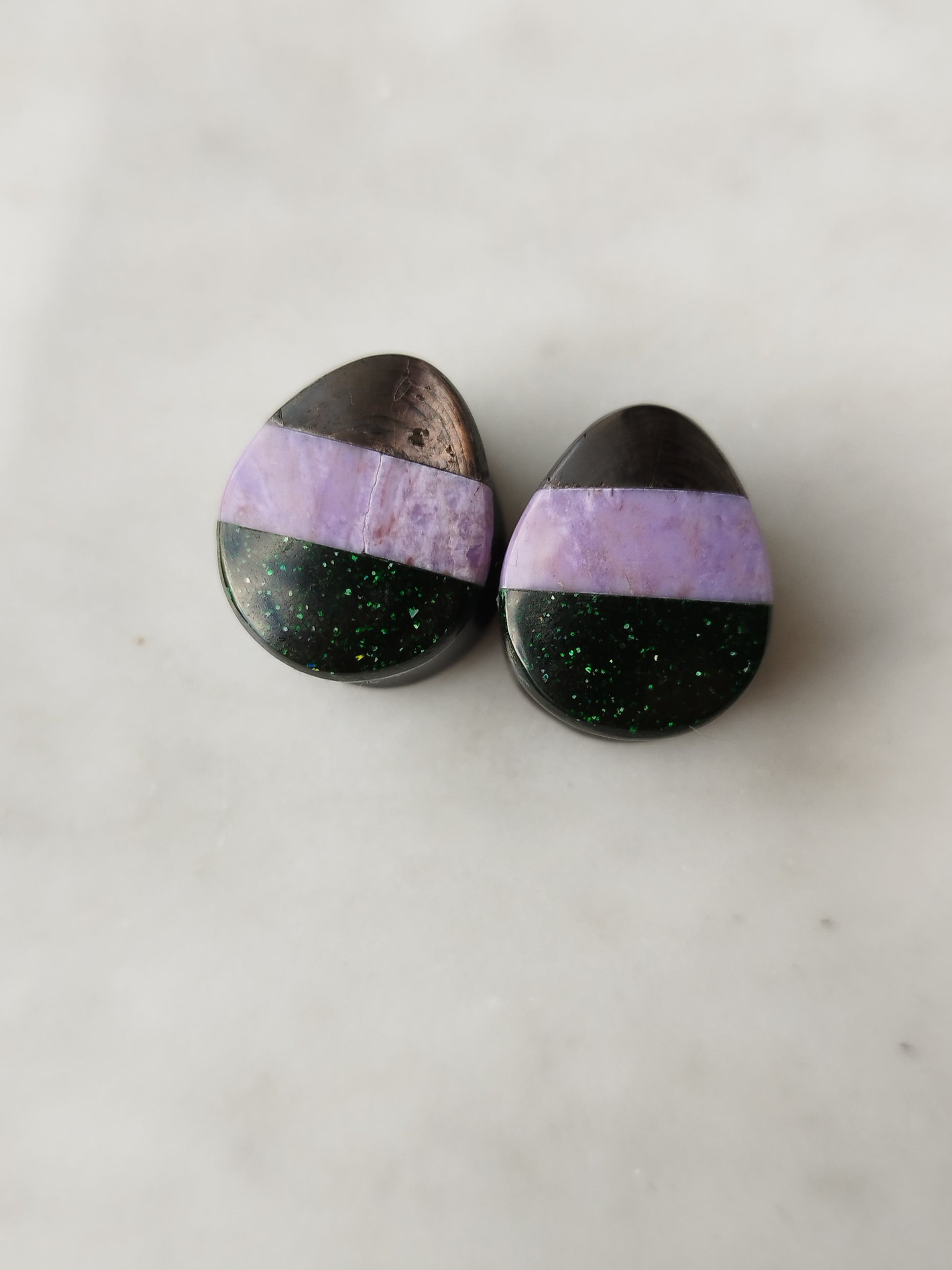 Obsidian teardrops with candy corn overlays. I made the candy corn from green Goldstone, Turkish purple jadeite and hypersthene